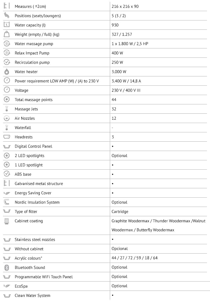 The hot tub and hot tub Feel, is the result of the continuous evolution of design that our hot tub Factory performs constantly. Besides the smooth and neat lines forms, this hot tub has been designed to provide the user greater confort and relaxation with two reclined seats ergonomically studied, along with the another three seats offering you a complete massage in all the áreas of your body.