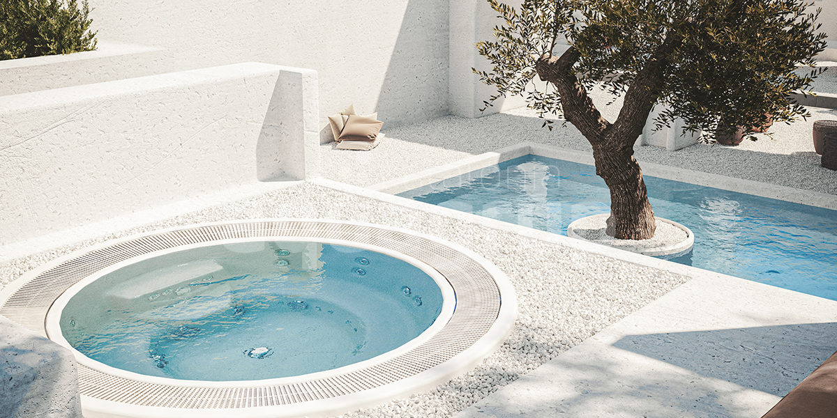 Mini pools are usually made of polyester, expanded polystyrene covered with microcement or gresite, or occasionally you might find mini pools made from stainless steel. Mini pools are designed for homes with limited outdoor or indoor space. There are various different options available on the market, in a variety of colours and materials, and they all offer different accessories and degrees of customisation.